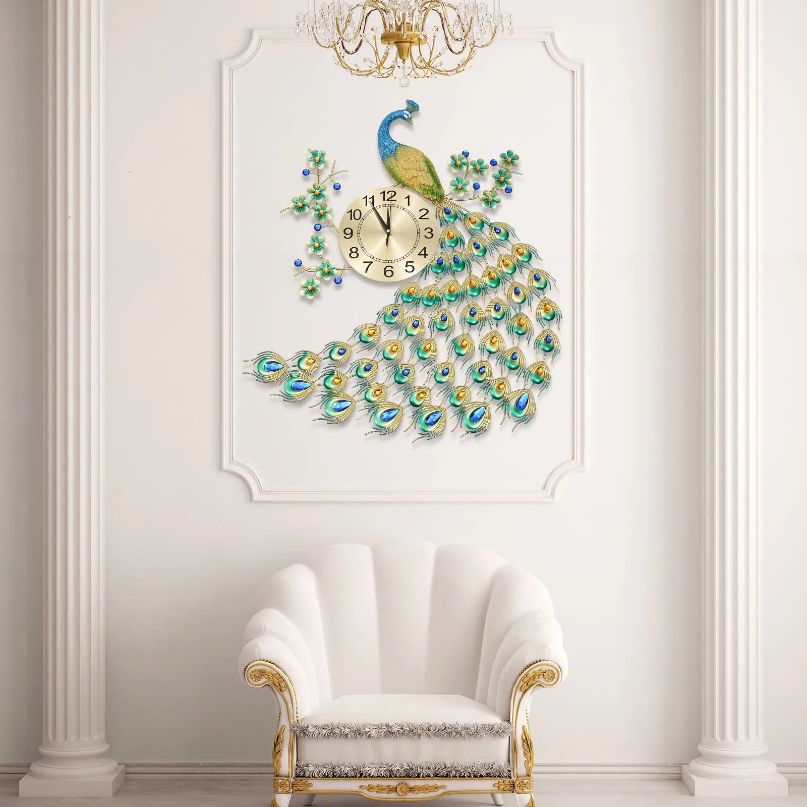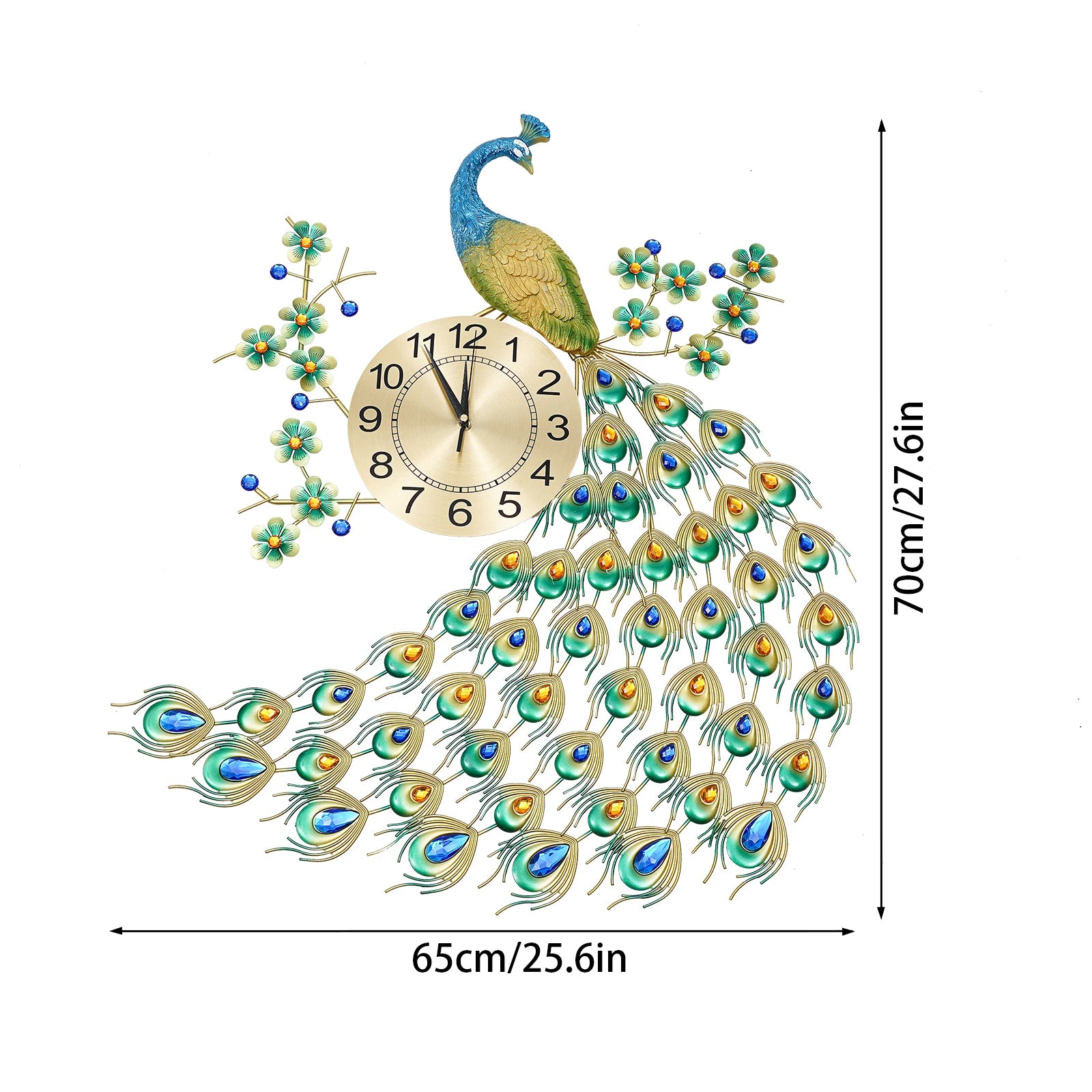 Luxury Peacock Wall Clock Metal 3D Art 8.26 Inch Decor