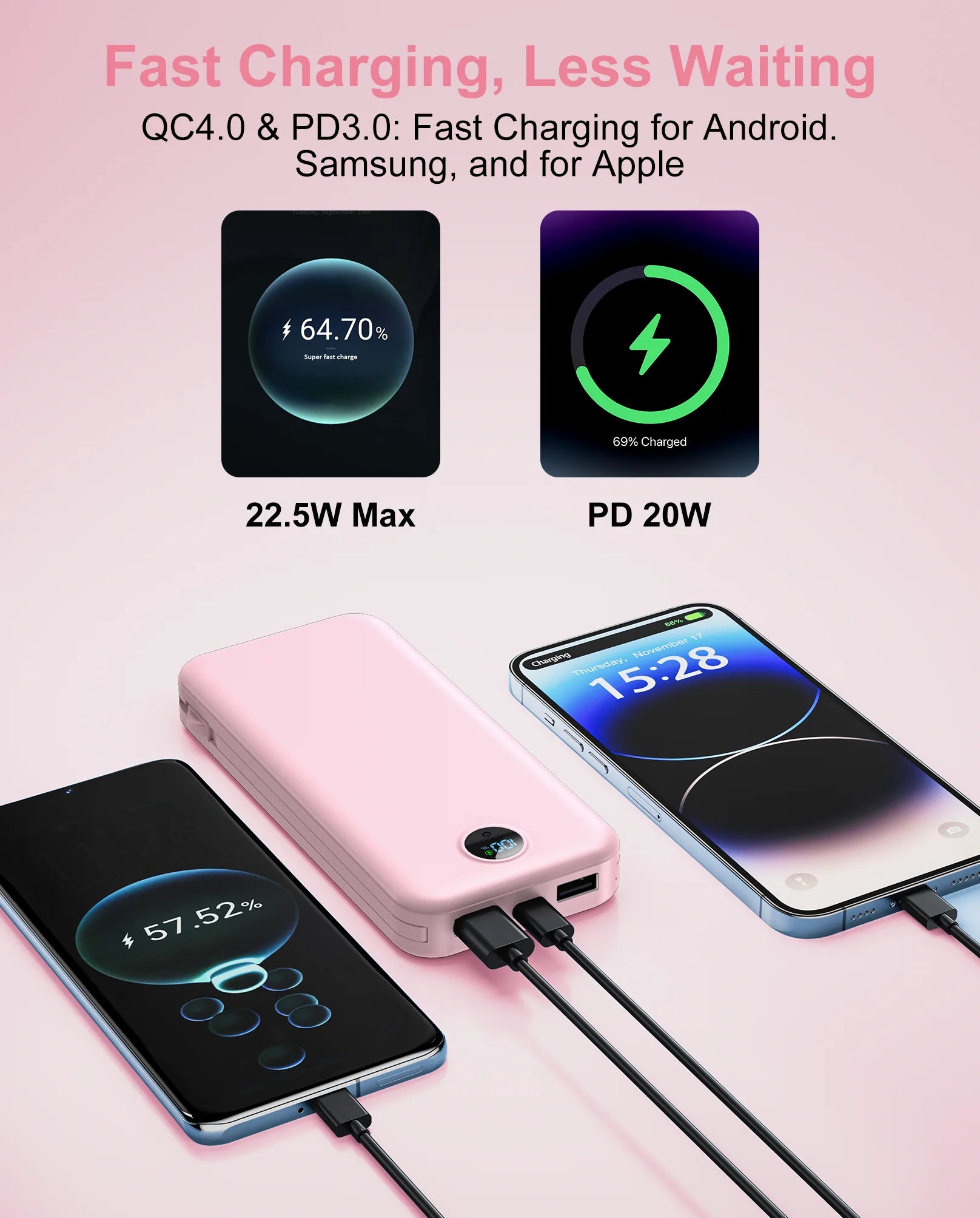 Stay powered on the go with the Ultra Thin 12000mAh USB C Power Bank Built In Cables.